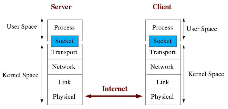 TCP/IP 통신은 소켓을 통해 클라이언트의 프로세스와 서버의 프로세스간에 데이터를 주고받는다. 소켓은 클라이언트 프로세스와 서버 프로세스를 통신을 위한 TCP 계층의 추상화된 인터페이스이다. 그리하여 TCP 소켓이라 부르며, 프로세스(User Sapce)와 OS의 네트워크 스택(Kernel Space)간에 데이터 입출력을 위해 Transport 계층과 Application 계층사이에 소켓이 존재한다.
