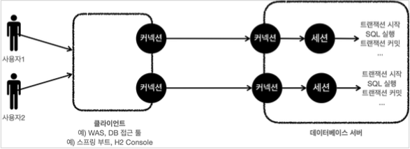 사용자의 요청에 의해 애플리케이션 서버(클라이언트)와 데이터베이스 서버가 커넥션이 생기고, 이 커넥션으로부터 세션을 통하여 SQL 실행, 트랜잭션을 시작하고, 커밋 또는 롤백을 통해 트랜잭션을 종료한다. 그리고 이후에 새로운 트랜잭션을 다시 시작할 수 있다. 이후, 사용자가 커넥션을 닫거나 DBA(DB 관리자)가 세션을 강제로 종료하면 세션은 종료된다.