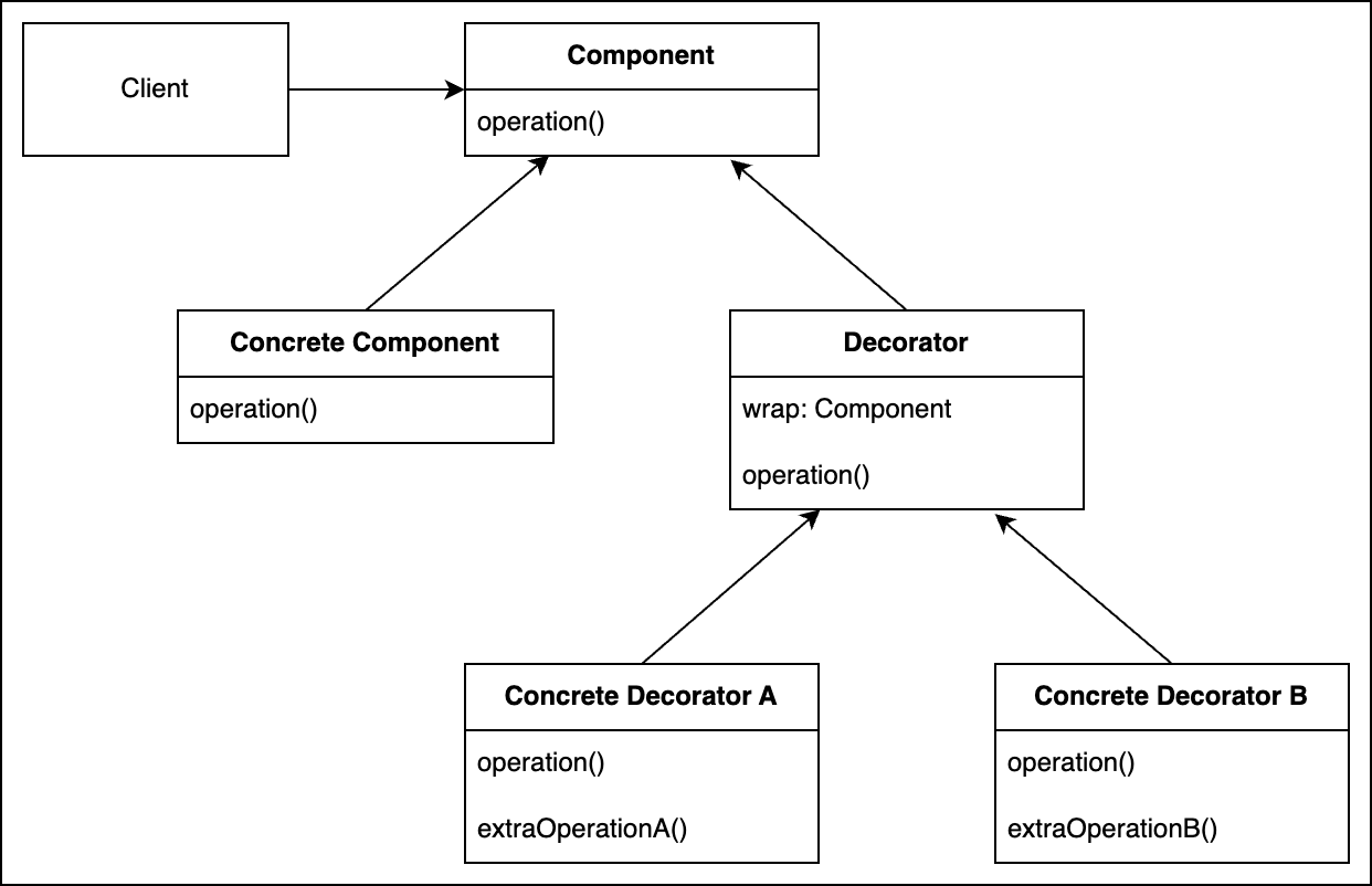- Component 인터페이스/추상 클래스: 보통 인터페이스로, 기본 기능을 나타내며, 기본 객체와 데코레이터는 해당 인터페이스를 구현해야 한다.