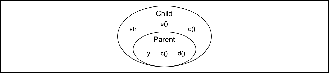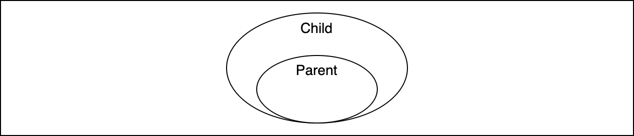 클래스는 멤버 (멤버 변수, 메서드)의 집합이다. 자식 클래스는 부모 클래스의 모든 멤버를 상속(Inheritance) 받는다. 그리므로 부모 클래스는 자식 클래스의 집합 관계로 표현될 수 있다.