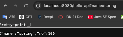 helloApi 메서드에서는 내부 클래스(Inner Class)인 Hello 클래스의 객체를 반환한다. 이때 객체는 기본적으로 JSON 형식으로 변환하여 응답하게 된다.
