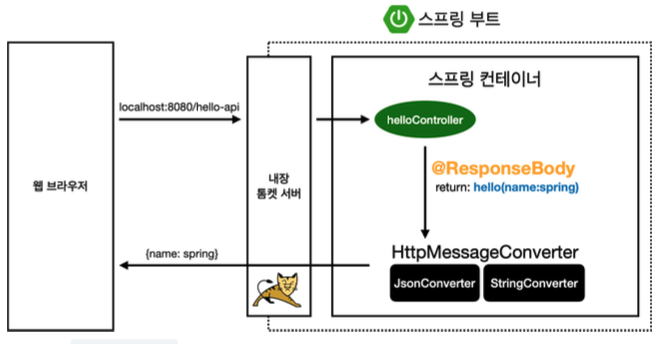 아래의 코드에서 @ResponseBody 어노테이션이 있어서, 스프링은 HTTP Message의 Body에 데이터를 실어서 응답을 하도록 한다. 해당 요청은 HTML 파일과 같이 렌더링한 뷰를 요청한 작업이 아니기 때문에, 위에서 처럼 컨트롤러에서 ViewResolver에게 요청을 넘기지 않고 HTTPMessageConverter에게 넘긴다.
