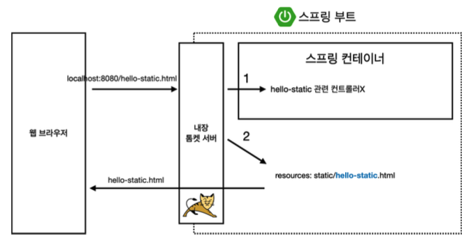 위처럼 hello-static.html 정적 파일을 요청하기 위해 http://localhost:8080/hello-static으로 url을 날리면, tomcat이 먼저 요청을 받고 스프링에 요청을 전달한다. 먼저, 스프링는 hello-static과 맵핑된 컨트롤러(Controller)의 요청을 찾는다.