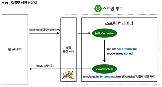 스프링 부트의 템플릿 엔진은 기본적으로 컨트롤러의 반환값이 ViewName과 맵핑이 된다. 위의 예제에서 ViewName은 hello-template이다. 그래서 ViewResolver 클래스의 객체는/resource/templates/{ViewName}.html에 일치하는 리소스를 찾는다.