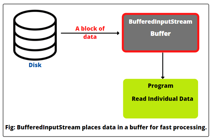BufferedInputStream는 내부적으로 버퍼(buffer)를 사용해서 데이터를 한 번에 큰 블록(예를 들어, 8KB)으로 읽어와 메모리의 임시 공간에 저장해 둔다. 이를 '버퍼링(buffering)'이라고한다. 이를 통해 데이터가 필요할 때마다 디스크에 접근하는 대신, 미리 읽어온 데이터를 메모리에서 빠르게 처리할 수 있게 된다.