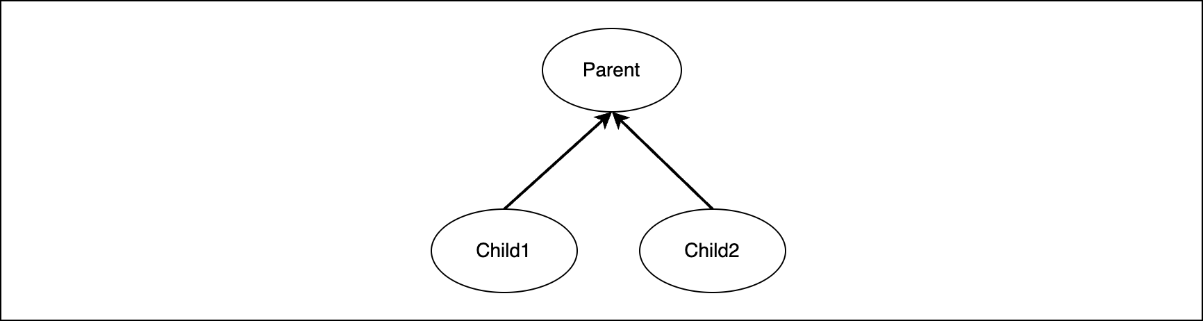 클래스 Child1과 Child2가 Parent 클래스를 상속받으면, 자식 클래스는 부모 클래스에 의존성이 생겨 다음의 상속계층도를 나타낸다.