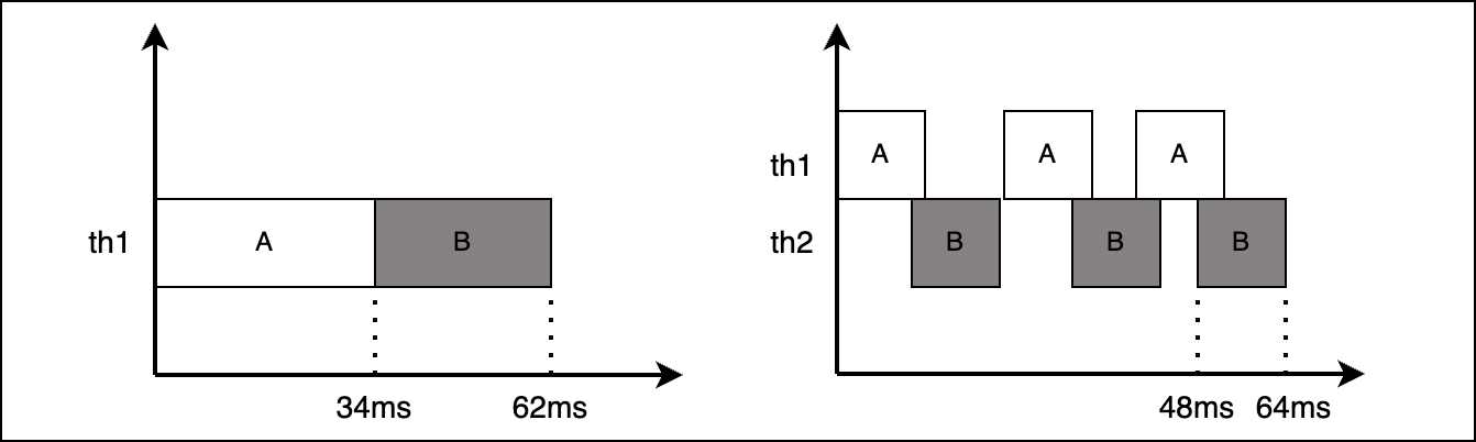하나의 스레드(th1)로 2개의 작업을 처리하면, A 작업을 마친 후에 B 작업을 시작한다. 두 개의 스레드(th1, th2)는 2개의 작업을 처리하면, 짧은 시간동안 A와 B 작업을 번갈아가면서 수행한다.